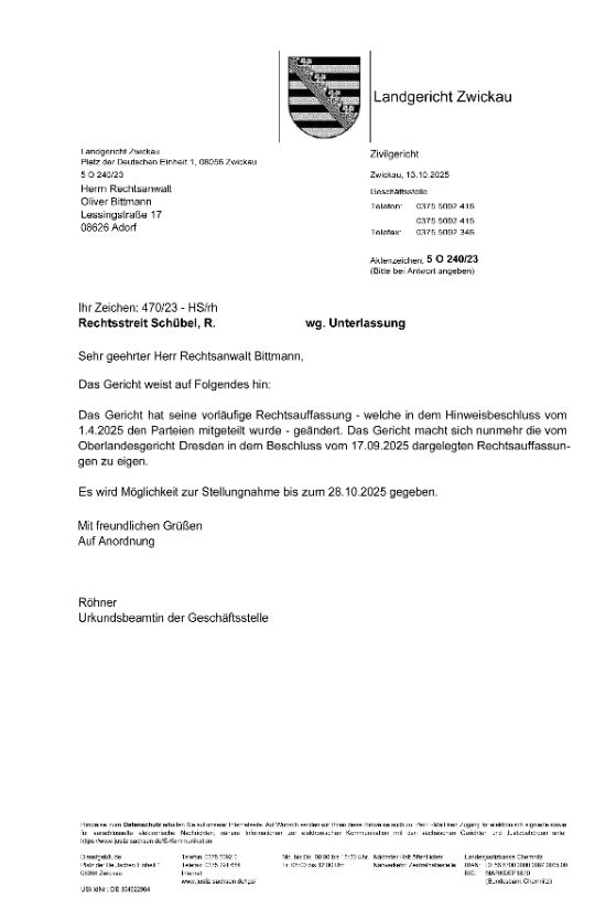 Das LG Zwickau hat seine vorläufige Rechtsauffassung geändert und dies mit der expliziten Übernahme der OLG-Auffassung im PKH-Beschluss begründet. Dieses Vorgehen ist aus folgenden Gründen hochproblematisch: